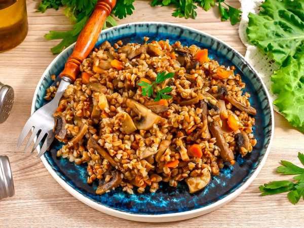 Обжарить кубиками морковь и грибы в масле растительном, добавить гречку, соль, перемешать, влить воду, довести до кипения, снизить огонь (я прям совсем минимально люблю) и тушить под крышкой, выпаривая лишнюю влагу. Можно в самом конце перемешать и добавить соль/масло, если надо.