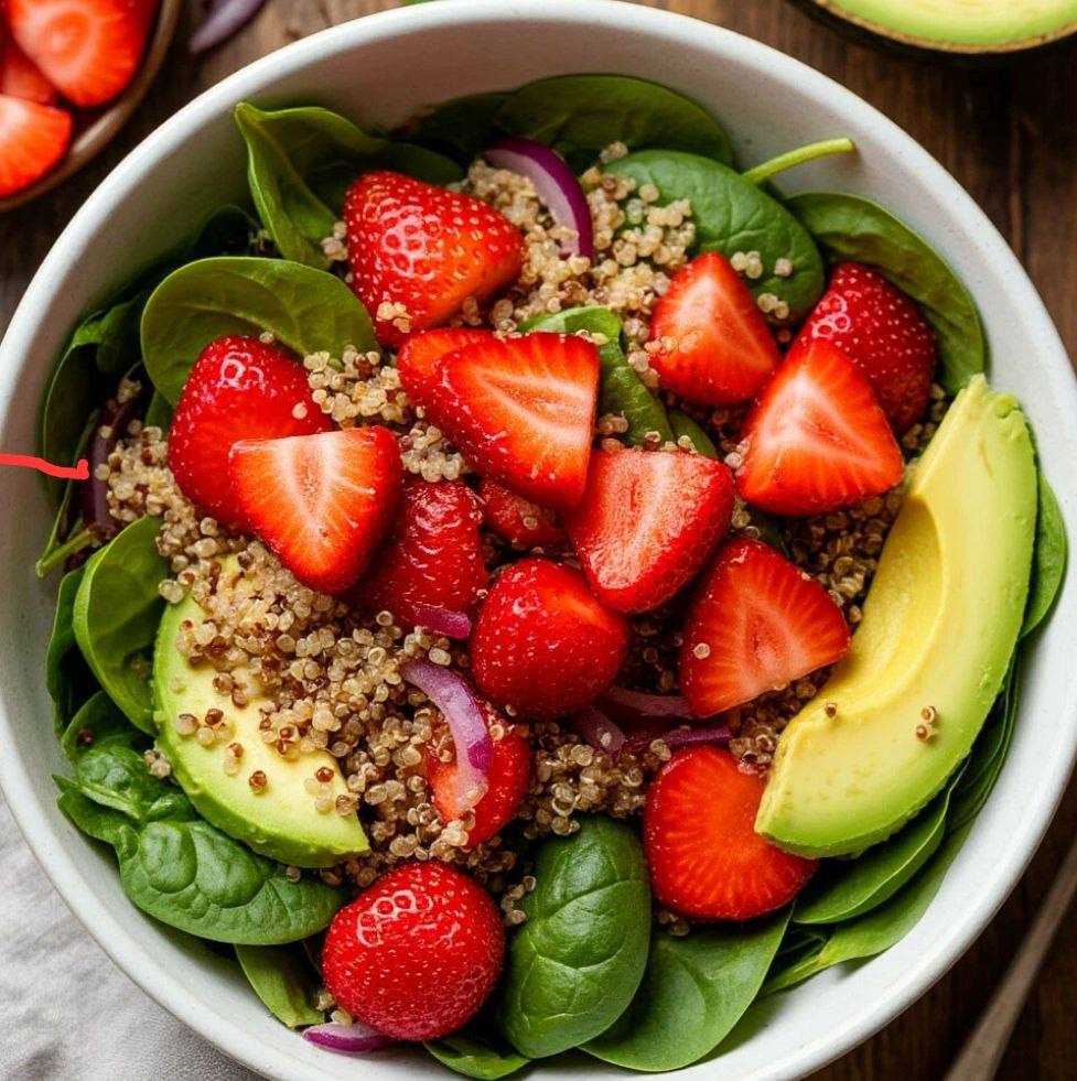 2.В большой миске смешайте шпинат, клубнику, огурцы, авокадо, красный лук и киноа.